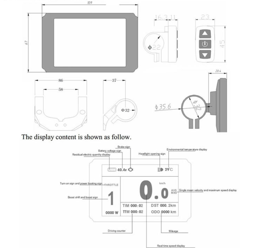 1. Data display:it shows the riding speed, a single mileage and cumulative mileage, riding time, power-assist gear, motor power and temperature, battery voltage and charge status, brake status and the used ambient temperature and other cycling parameters;