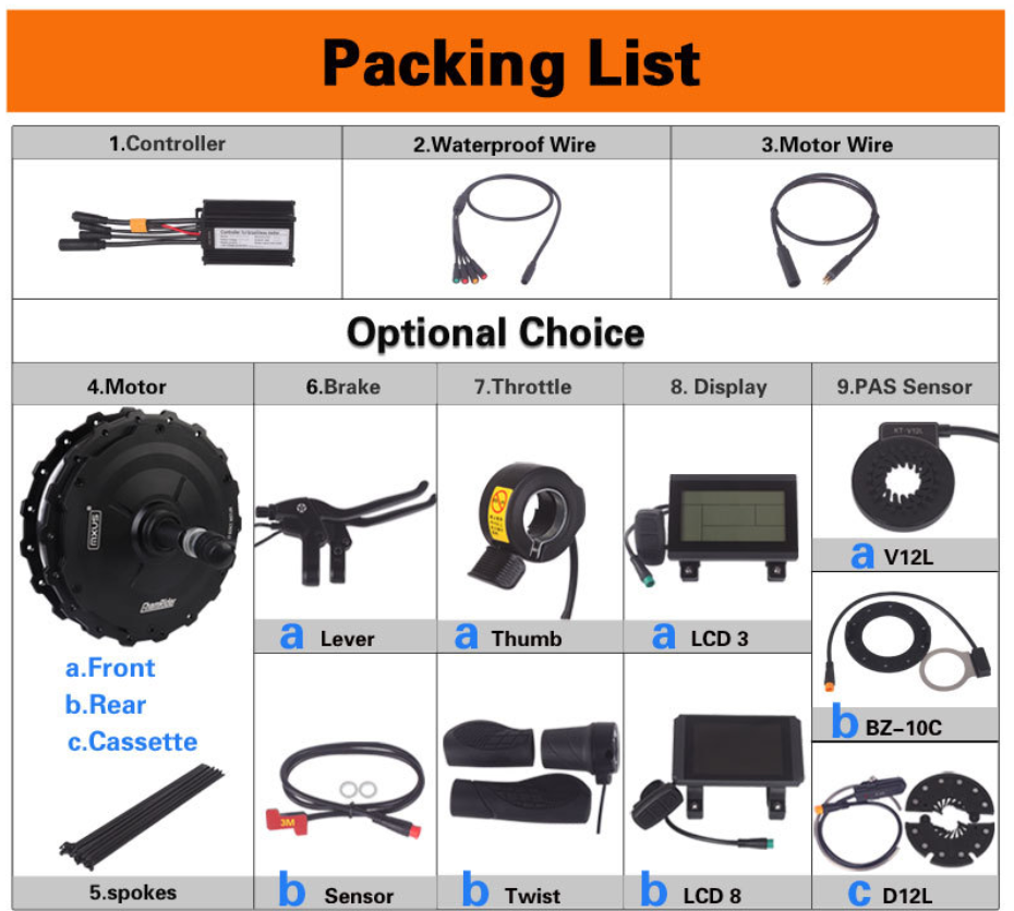 This kit comes with everything you need to convert your bicycle to an E-bike EXCEPT Rim,battery and charger. Here's the packing list: