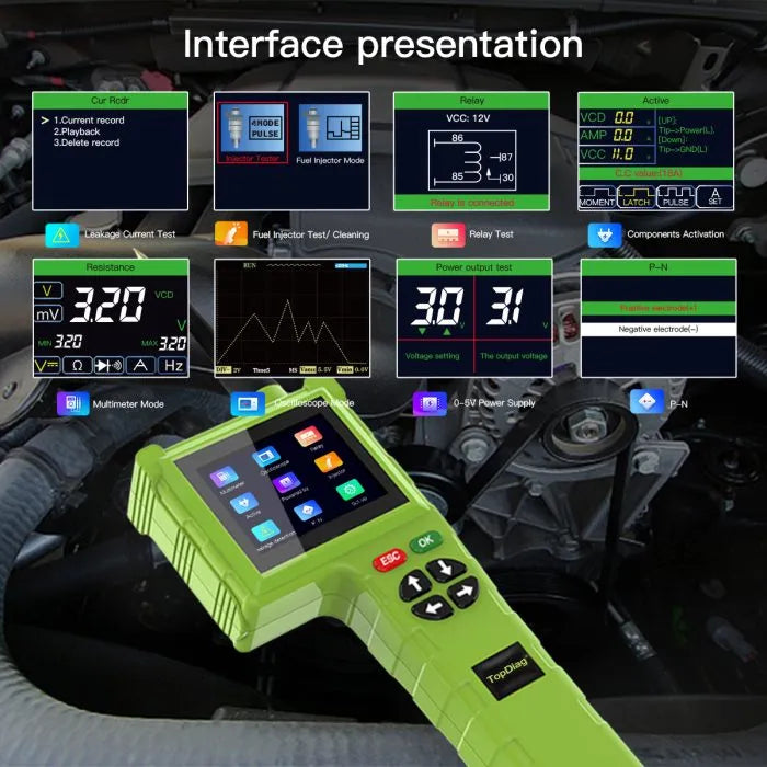 Enhanced Functions and an Upgrade from P200. The Topdiag P200 Pro power circuit probe kit, an upgraded version, has finally been released following an extensive period of research and development. The improved multimeter and oscilloscope function of the Topdiag P200 Pro allows for more accurate testing and display of data (voltage, resistance, diode, current, etc.). Additionally, the P200 Pro circuit tester now includes additional functions like relay testing, injector testing and cleaning, and leakage current testing.